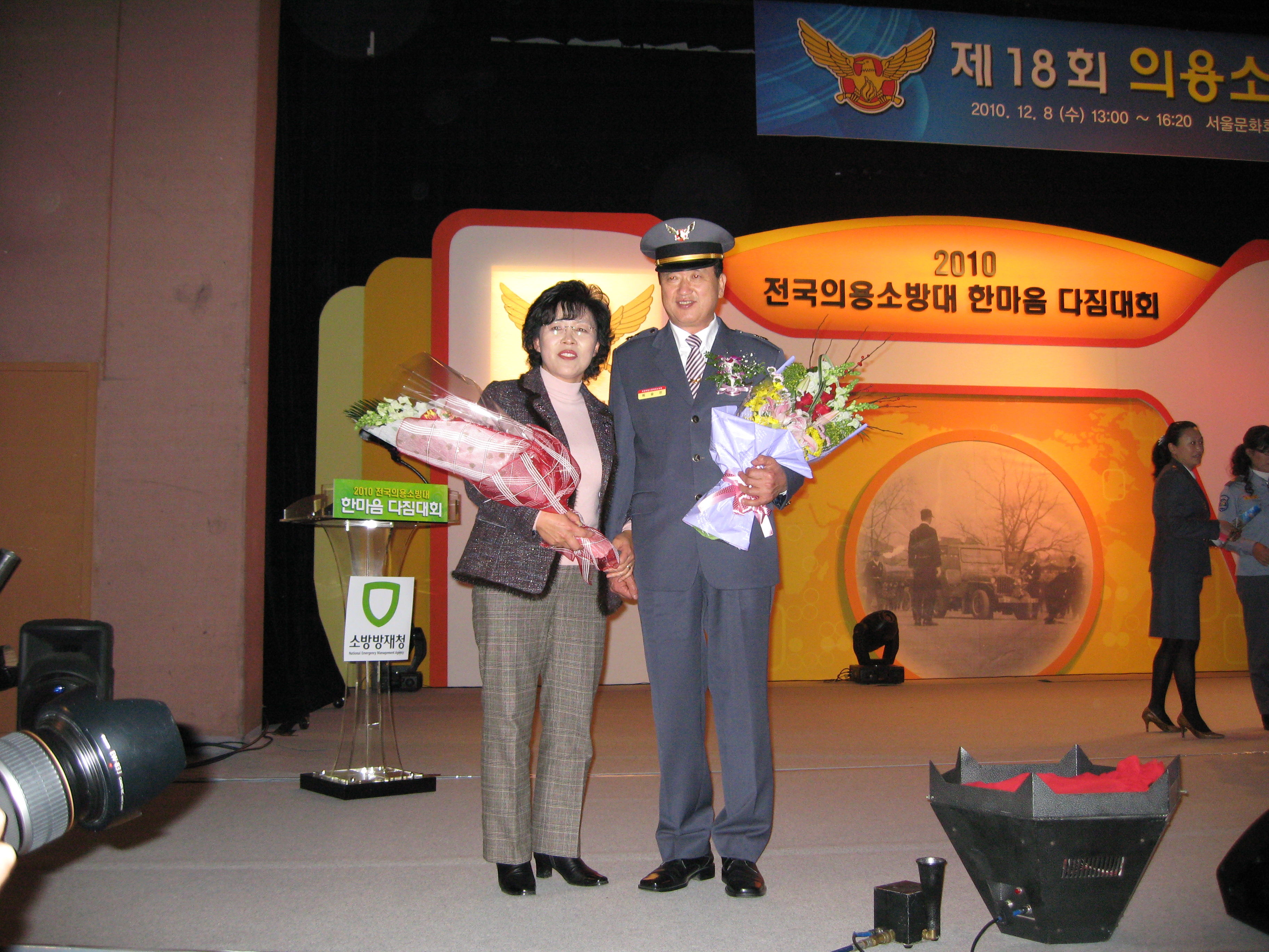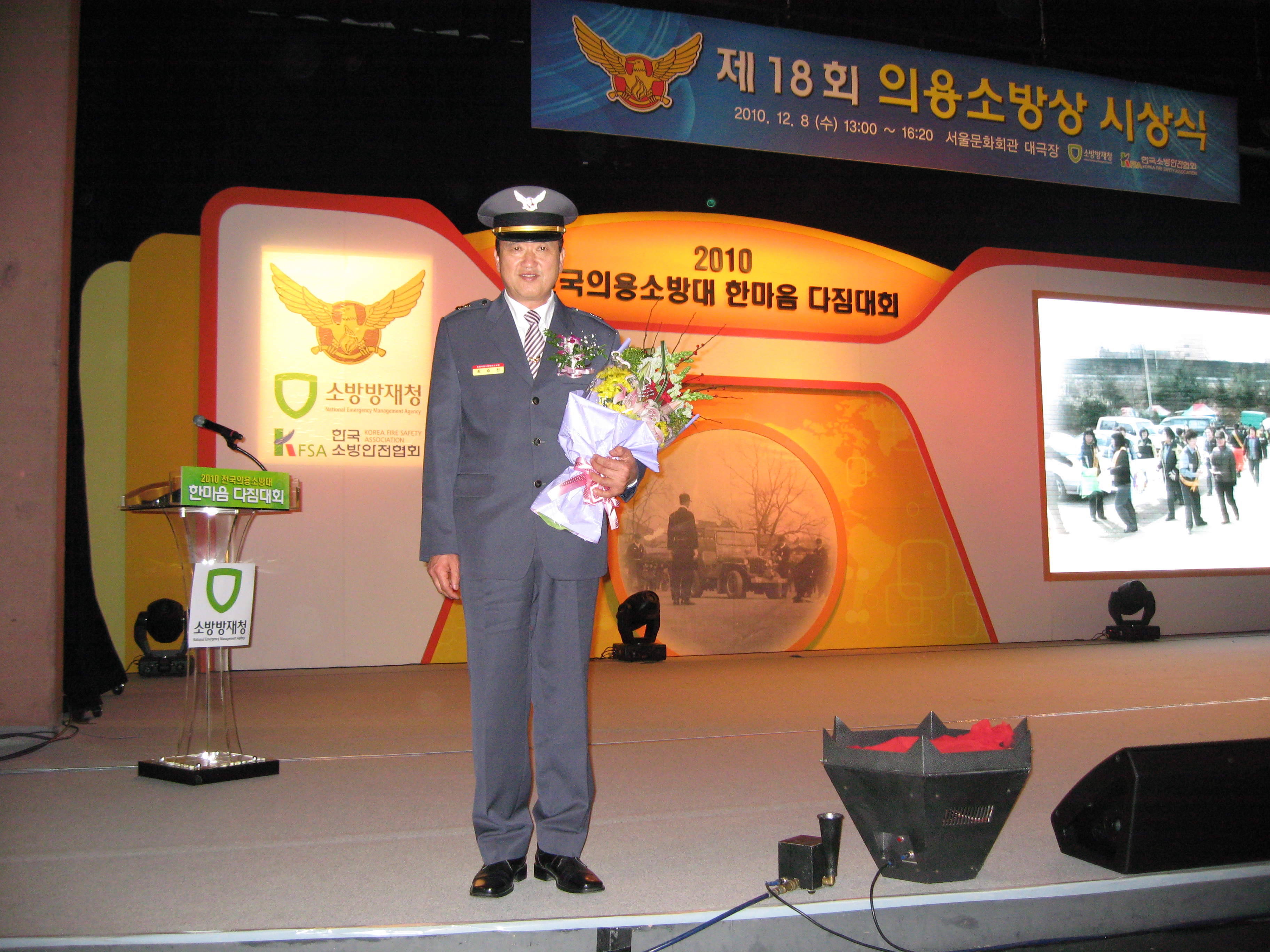춘천소방서 춘천의용소방대 지도부장 최승진(남,58세)씨는 소방방재청에서 주관하는 “2010 전국의용소방대 한마음 다짐대회”에 참가하여 “제18회 의용소방상 본상(행정안전부장관)”을 수상했습니다. 의용소방대의 사기진작과 봉사의식 함양을 위한 한마음 다짐대회는 12월 8일 서물교육문화회관 대극장에서 개최되었으며, 최승진씨는 의용소방대의 변화와 발전에 기여하고 헌신?봉사를 실천하는 모범대원으로 선정되어 표창을 수상했습니다.