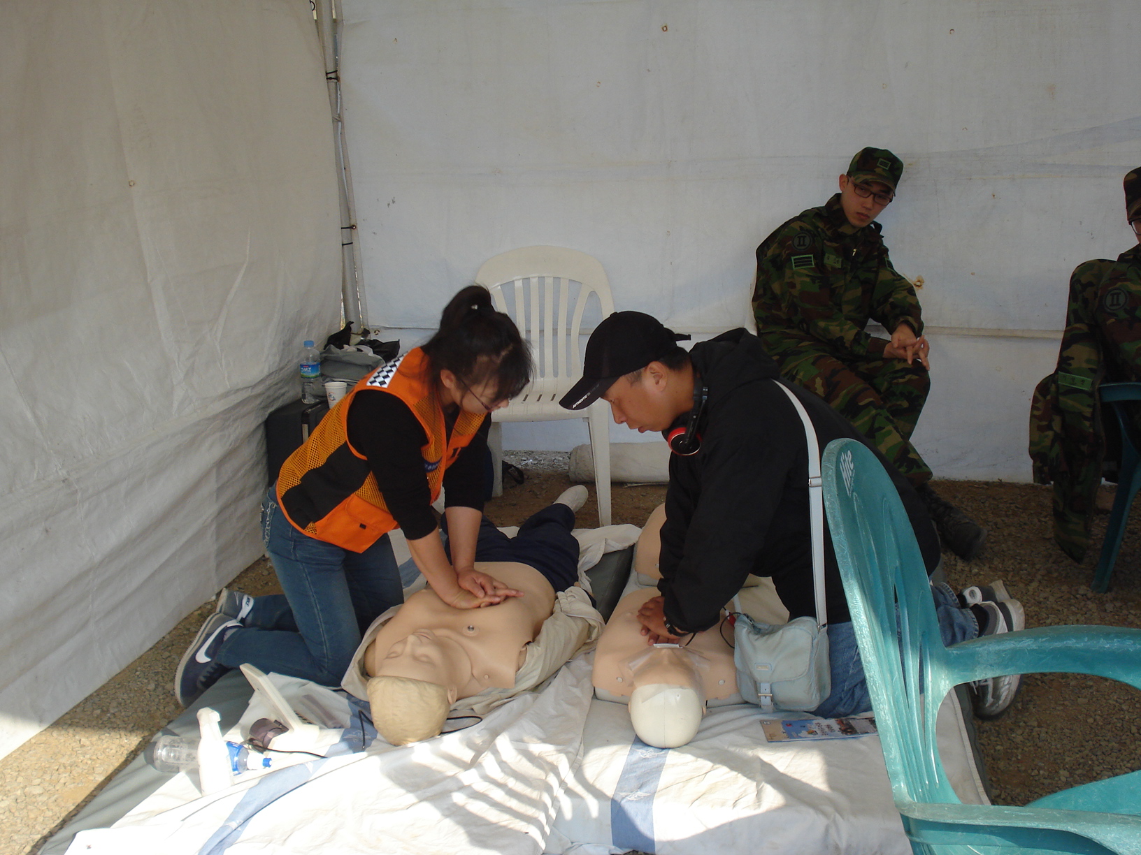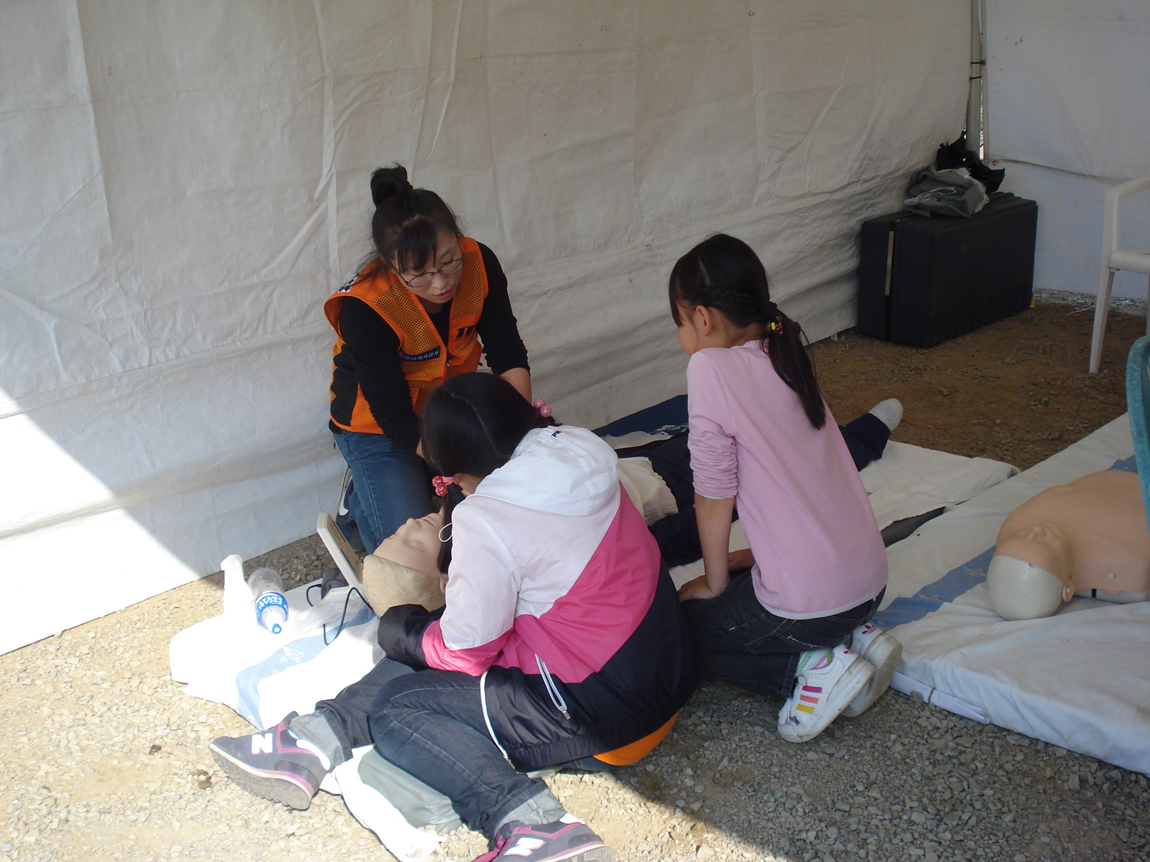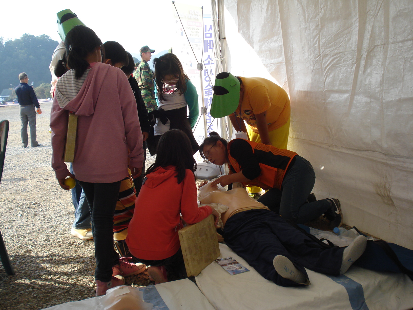 쌍용부대에서 행사 가운데 심폐소생술 체험장을 하고있어요 엄청더운날씨에 고생한 안순옥 대장님,김을경 총무님,한옥자 부장님,송정화 대원 이틀간 수고했어요
