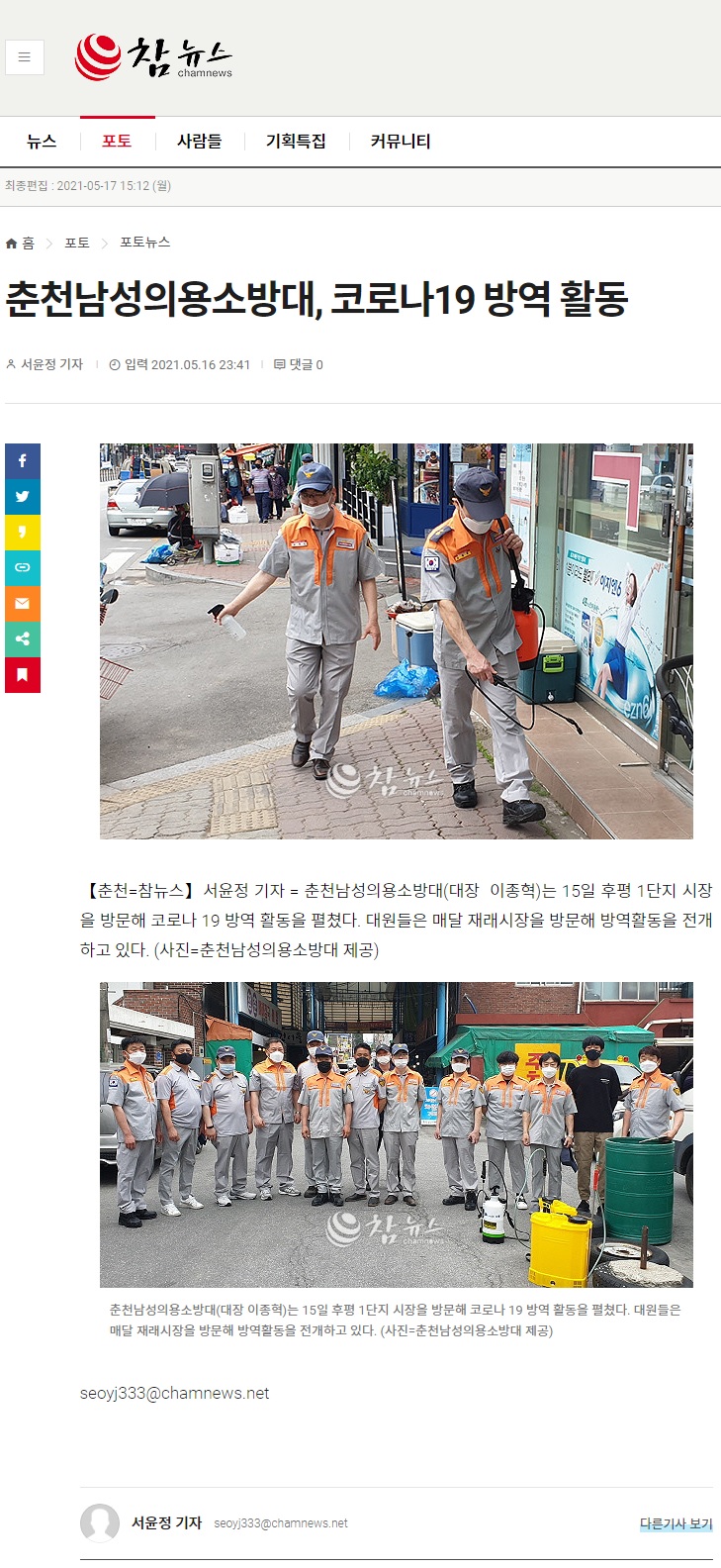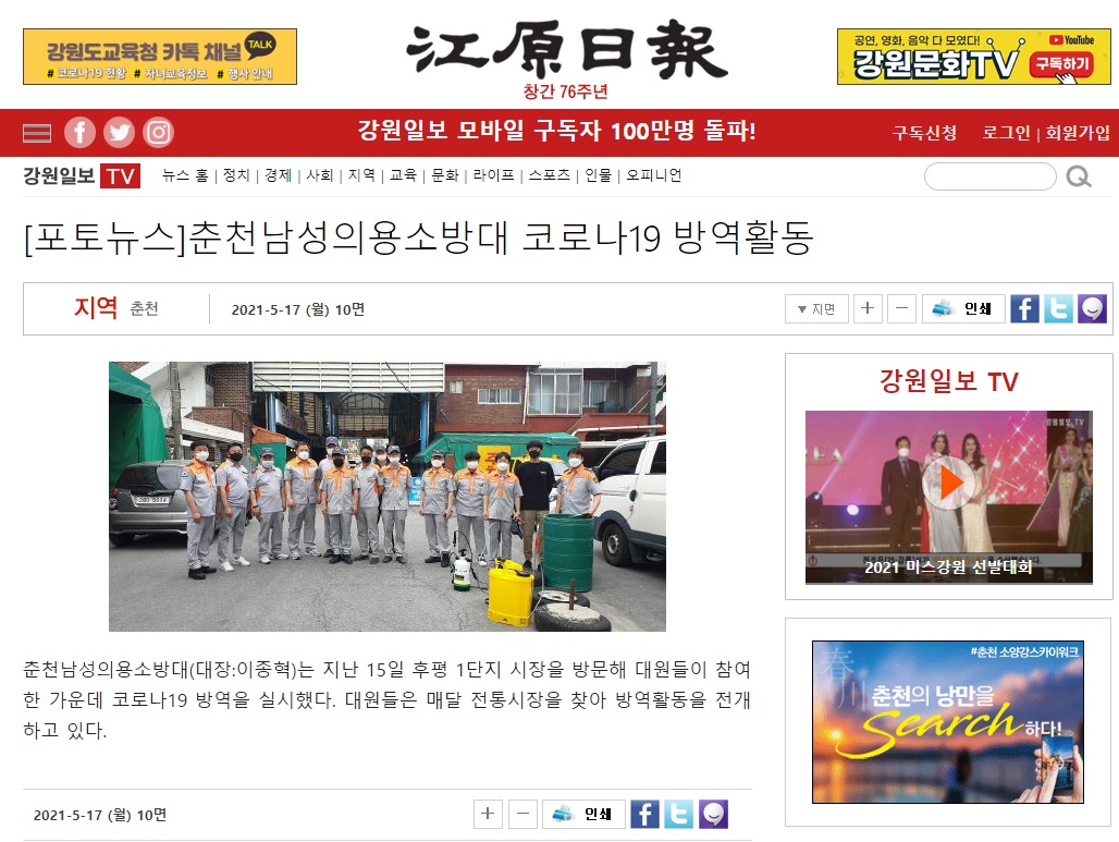 춘천남성의용소방대(대장 이종혁)는 지난 5월 15일 춘천시 후평동에 위치한 후평 1단지 시장을 방문해 코로나 19 방역 활동을 펼쳤다.