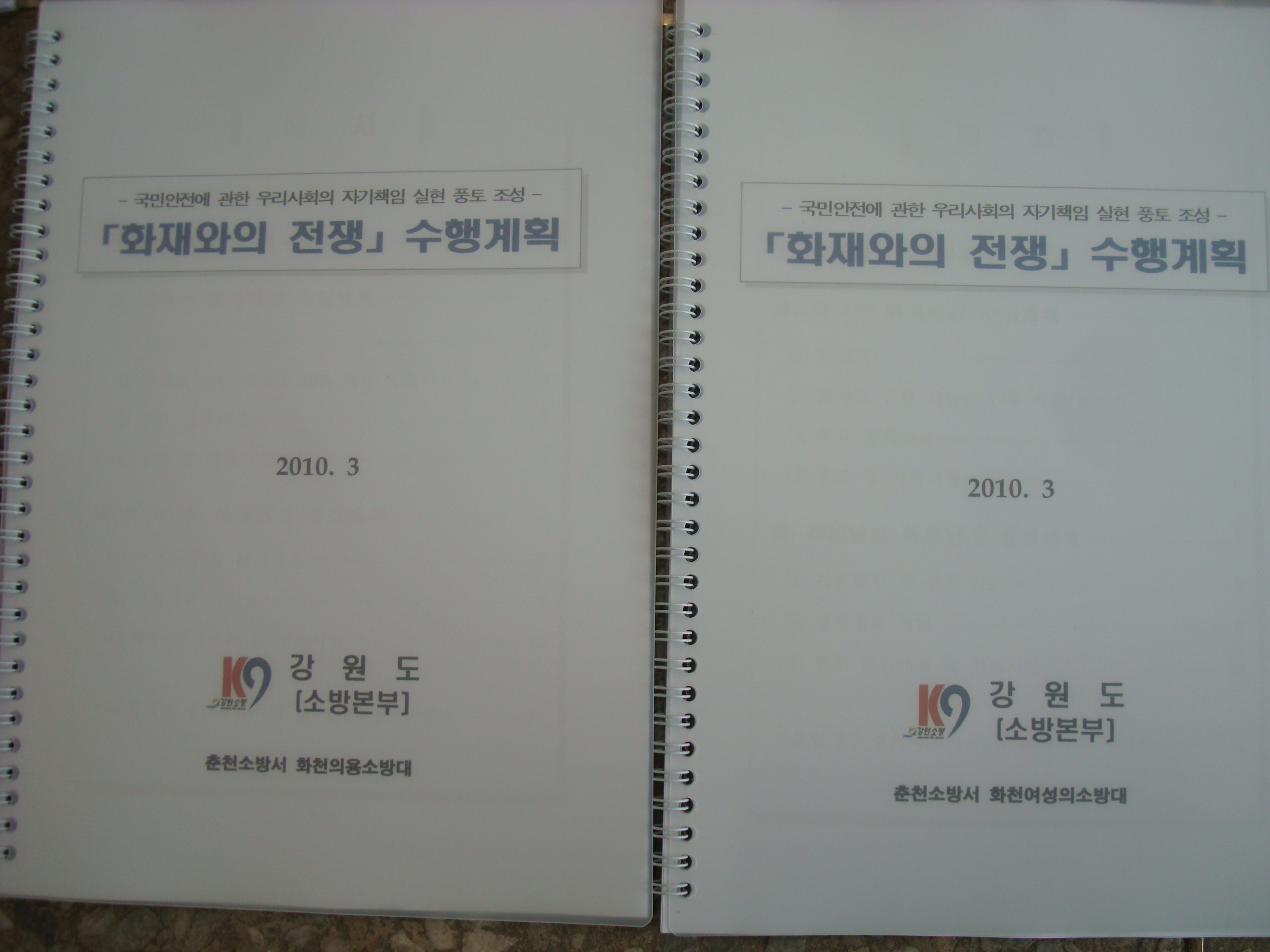 화천119안전센터(센터장 김교성)에서는 2010년 소방업무 추진중인 화재로인한 사망률 10%이상 저감목표 달성을 위하여 화천119안전센터 직원들 및 화천의용소방대연합회 대원들에게도 책자를 제작하여 전원 숙지할수 있도록 하였습니다.
