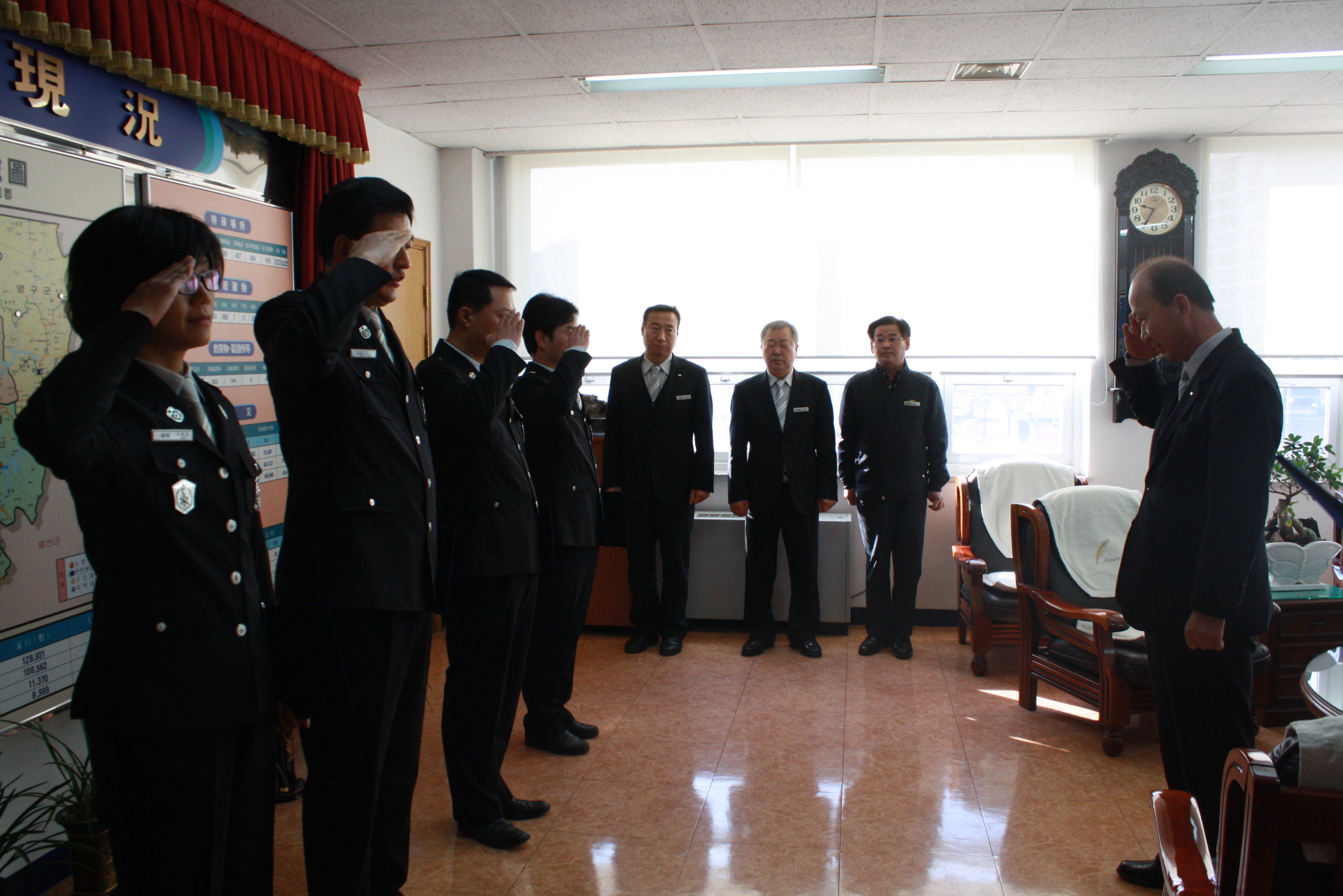 춘천소방서(서장 조완구)는 2012.02.29(수) 인사별령 신고식을 가졌습니다. 서장님께서는 다시 복직하신 직원(소방경 정희정)을 격려하셨고 타부서로 가시는 분들(소방경 송병익, 위 최승철, 장 박상춘)께 앞으로 더 열심히 일해줄것을 당부하셨습니다. 아울러 신규 임용된 직원(소방위 김봉배)을 축하해 주시며 앞으로 안전하고 열심히 근무할 것을 강조하셨습니다.