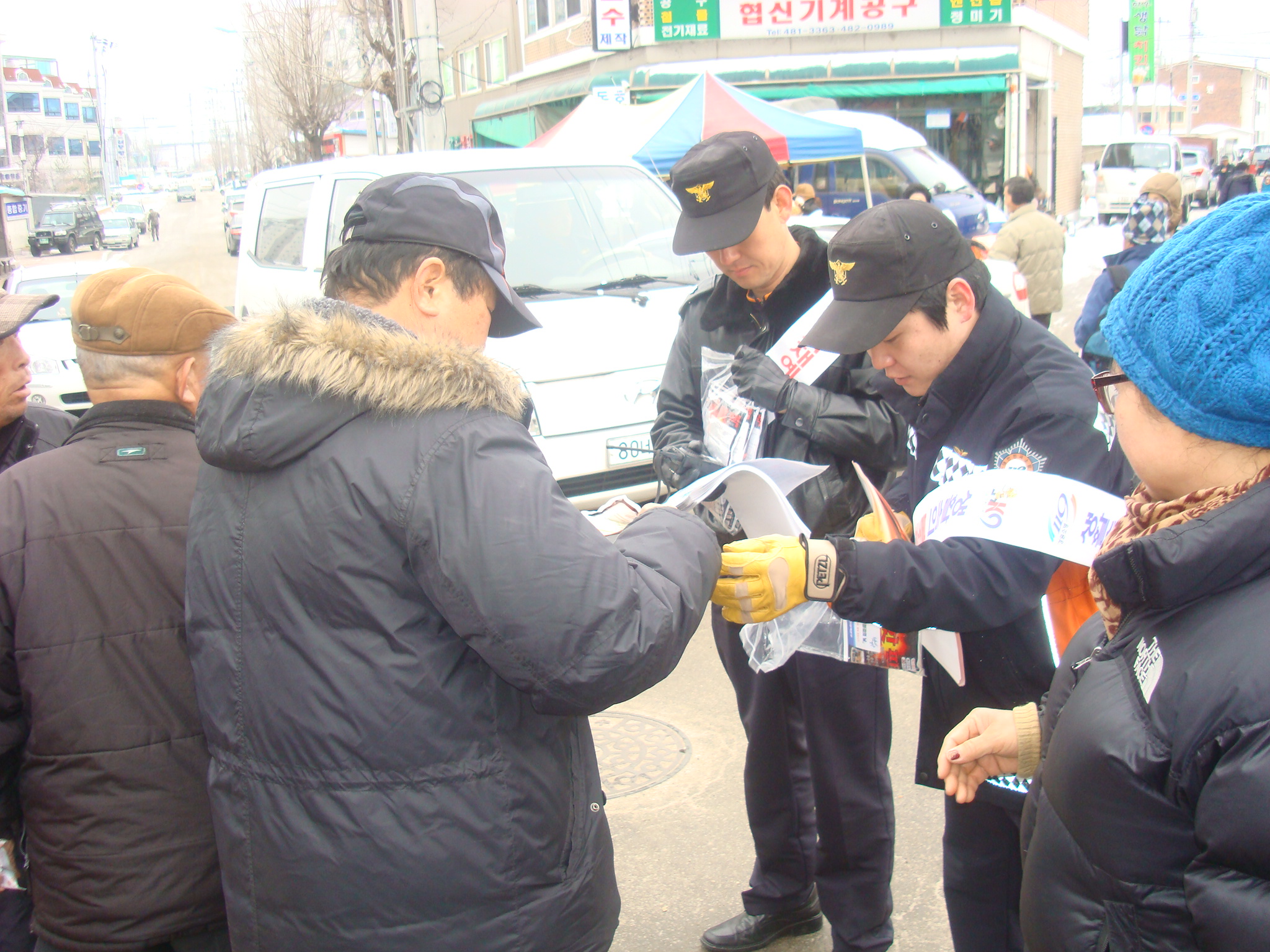 추운 날씨에도 불구하고 양구읍 의용소방대와 남면 의용소방대원분들이 함께 자리를 해주셨습니다. 시장내에서 화재발생시 대피요령과 신고방법 등이 적힌 전단지를 나누어 주며 화재예방에 대한 경각심을 높히는 뜻 깊은 자리였습니다.