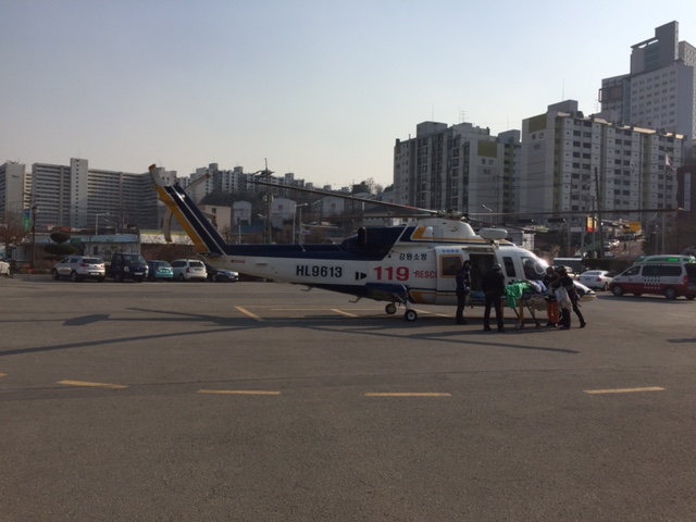 2016.3.16(수) 춘천소방서 청사에 강원소방헬기가 착륙하여 강원대학병원 응급환자를 서울지역 대형병원으로