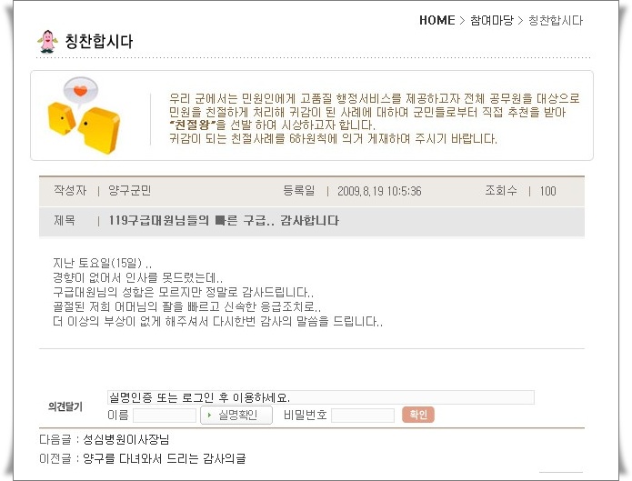 | 35 | 우리 칭찬 받았습니다.^^ | 양구119안전센터 | 2009-08-21 | 1510 | |