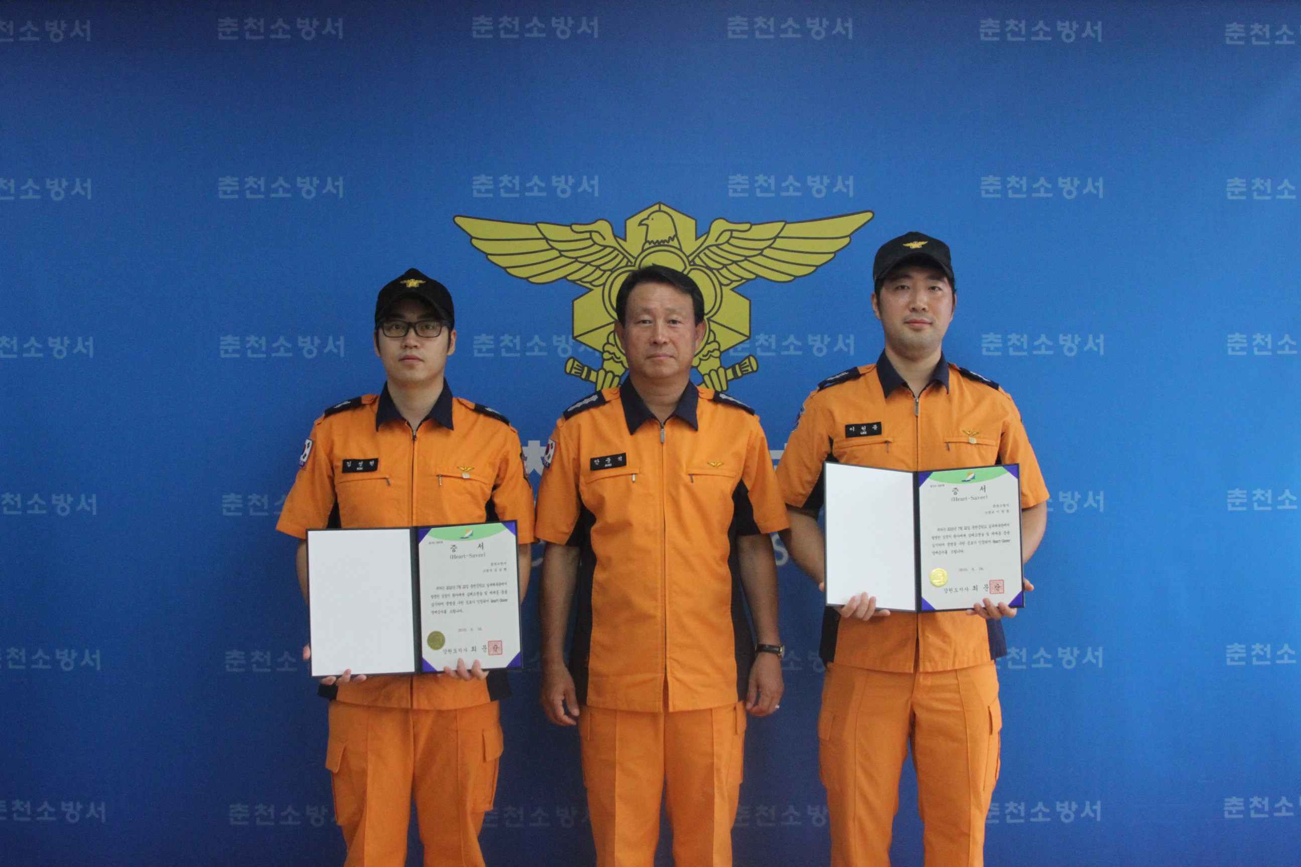 춘천소방서(서장 안중석)는 7일 심폐소생술로 소중한 생명을 살린 효자구급대원 소방교 이원종(34), 소방사 김성현(35)에 대하여 하트세이버 인증서 및 배지를 수여했다.
