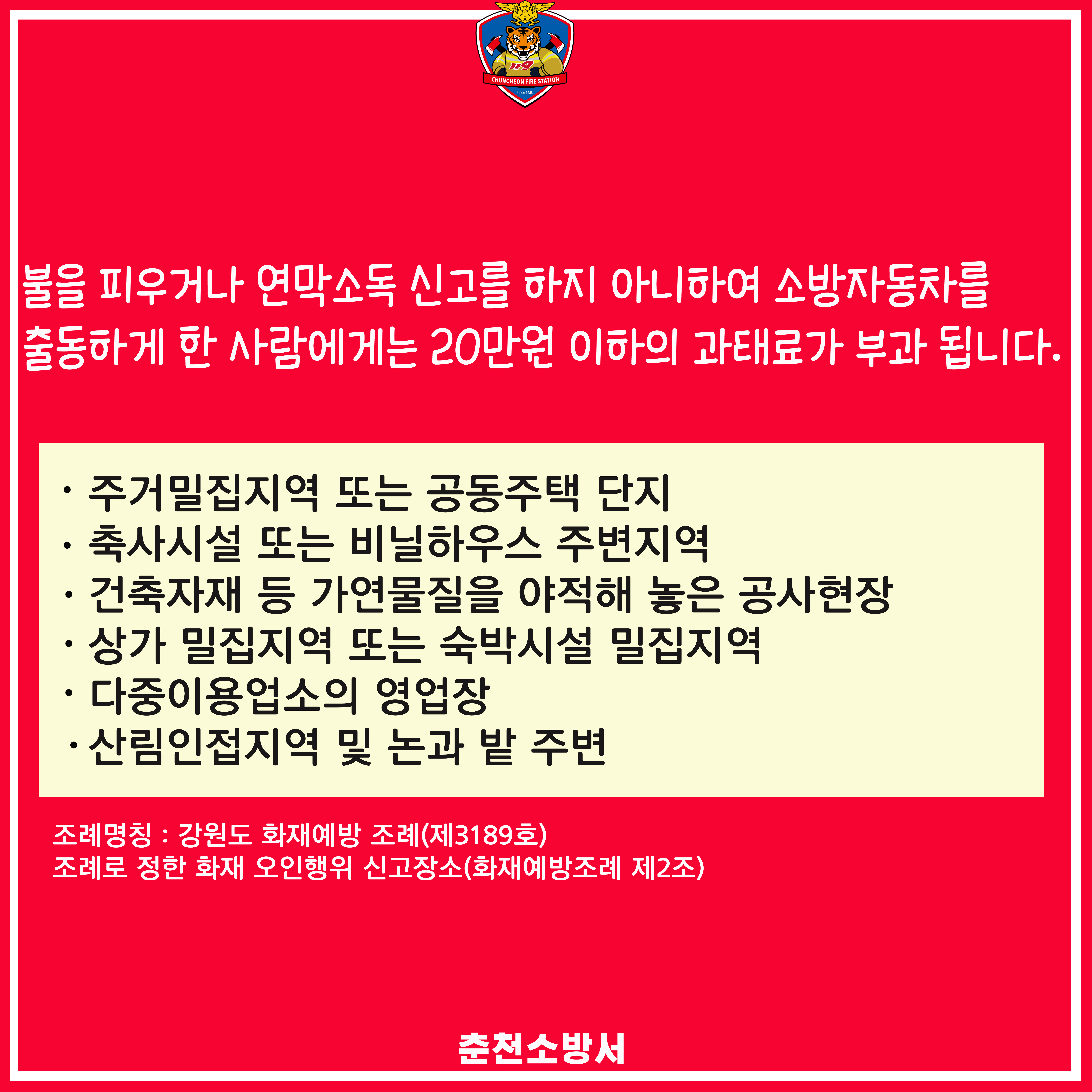 춘천소방서(서장 정광현)는 강원도 화재예방조례 명칭 변경 및 화재 오인행위 미신고에 의한 과태료 부과 사항에 도민의 불이익을 최소화 하고자 적극적인 화재예방조례 홍보를 실시하겠다고 밝혔다.