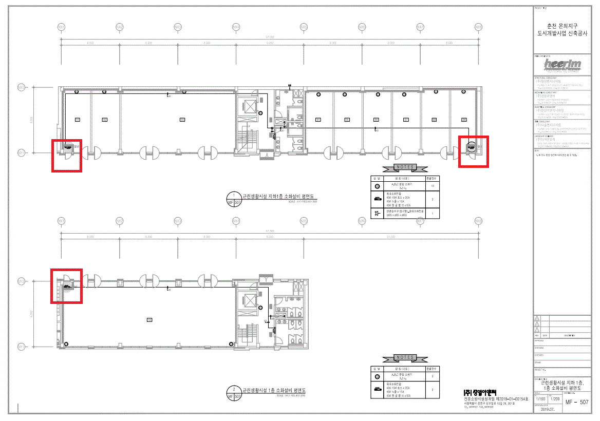 2.춘천 온의지구 도시개발사업 공동주택 신축공사 현장에 약 1.2㎡으로 구획된 실에 옥내소화전함 상부에 함께 설치된 자동화재탐지설비의 발신기세트의 설치에 관한 내용입니다.