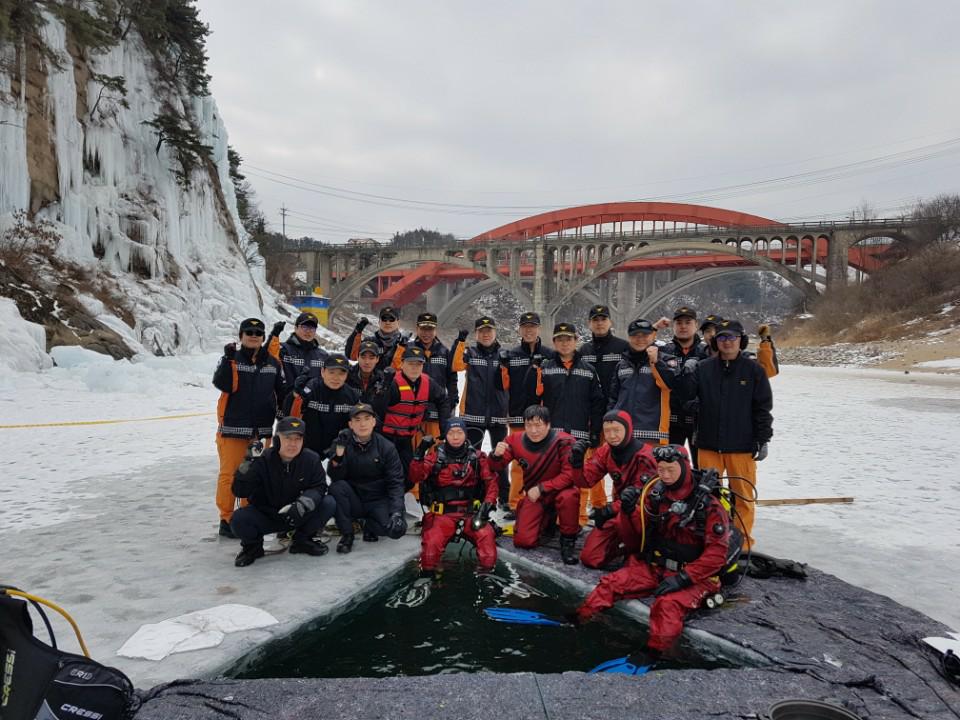 이날 훈련은 ▲ 수난구조장비 조작법 및 사용요령 숙달훈련 ▲ 잠수장비를 이용한 수중 인명구조 기술숙달훈련 ▲ 수중검색 요원과 의사전달 방법 및 안전확보 ▲얼음 및 수중탐색과 빙상사고 인명구조 방법 등 인명구조 대응능력향상에 중점을 두고 진행됐다.