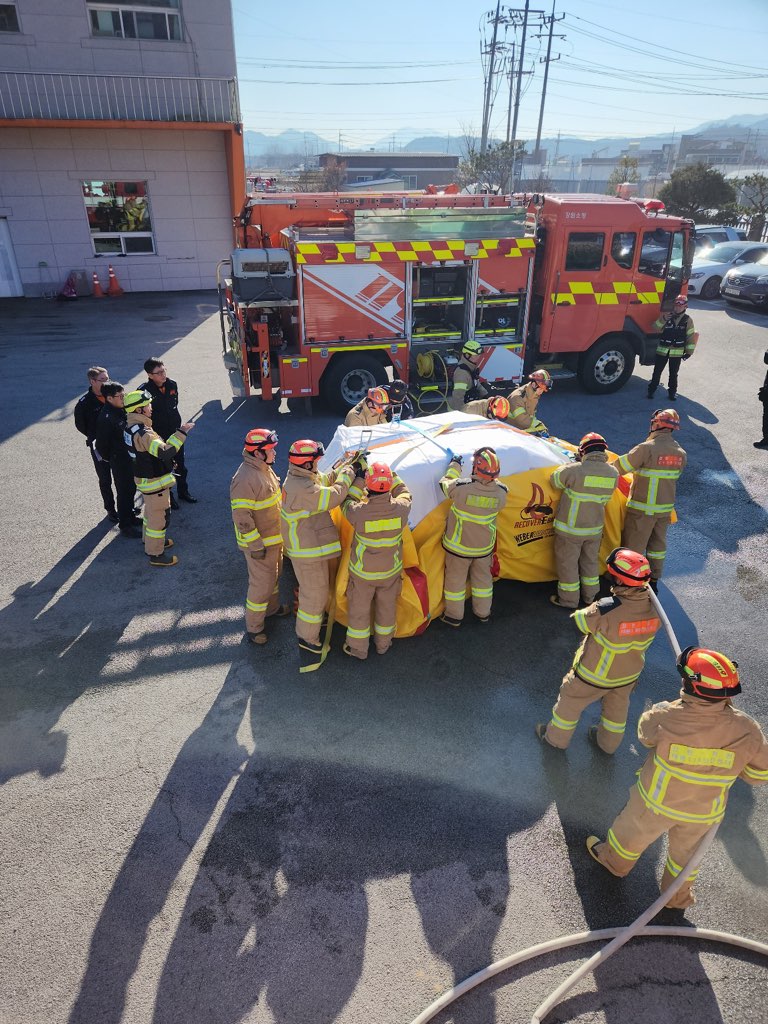 철원소방서 주차장에서 실시한 이번 훈련은 이동식 냉각 수조와 상방형 노즐을 이용하여 실시했다.