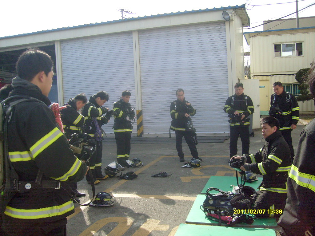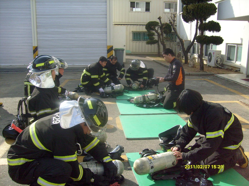 공기호흡기 및 면체 관리요령과 위급상황시 대처 요령을 주지시켜 보다 안전하게 현장활동에 임할수 있도록 교육하였다.