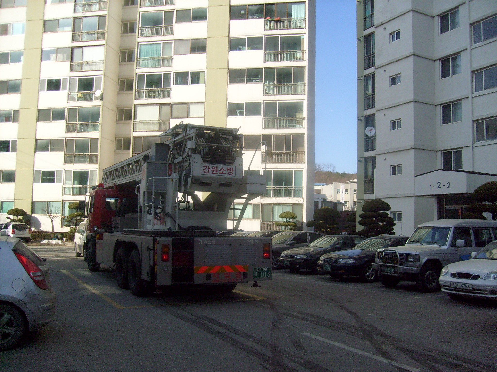 센터장 유승용 외 1팀 대원6명은 현지적응훈련차 천곡동에 위치한 삼성아파트에 출동하였다. 고층아파트에 발생할수 있는 화재에 대비하여 고가사다리의 출동로 파악 및 전개 훈련을 실시하였다.