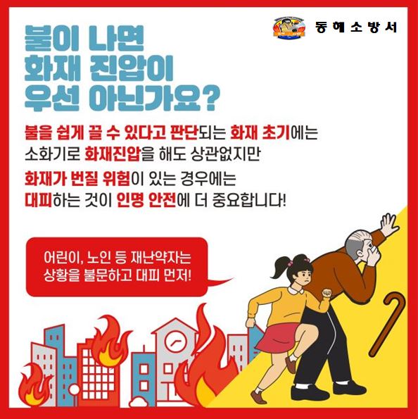 동해소방서(서장 김정희)는 봄철 화재예방대책의 일환으로 화재 발생 시 인명피해를 최소화하기 위하여 「불나면 대피먼저」 를 집중 홍보한다.