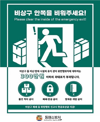 동해소방서(서장 김춘식)는 화재 등 각종 사고 발생 시 피난통로 확보와 자율적인 안전관리를 위한 비상구 폐쇄 등 불법행위 신고포상제를 운영한다고 밝혔다.