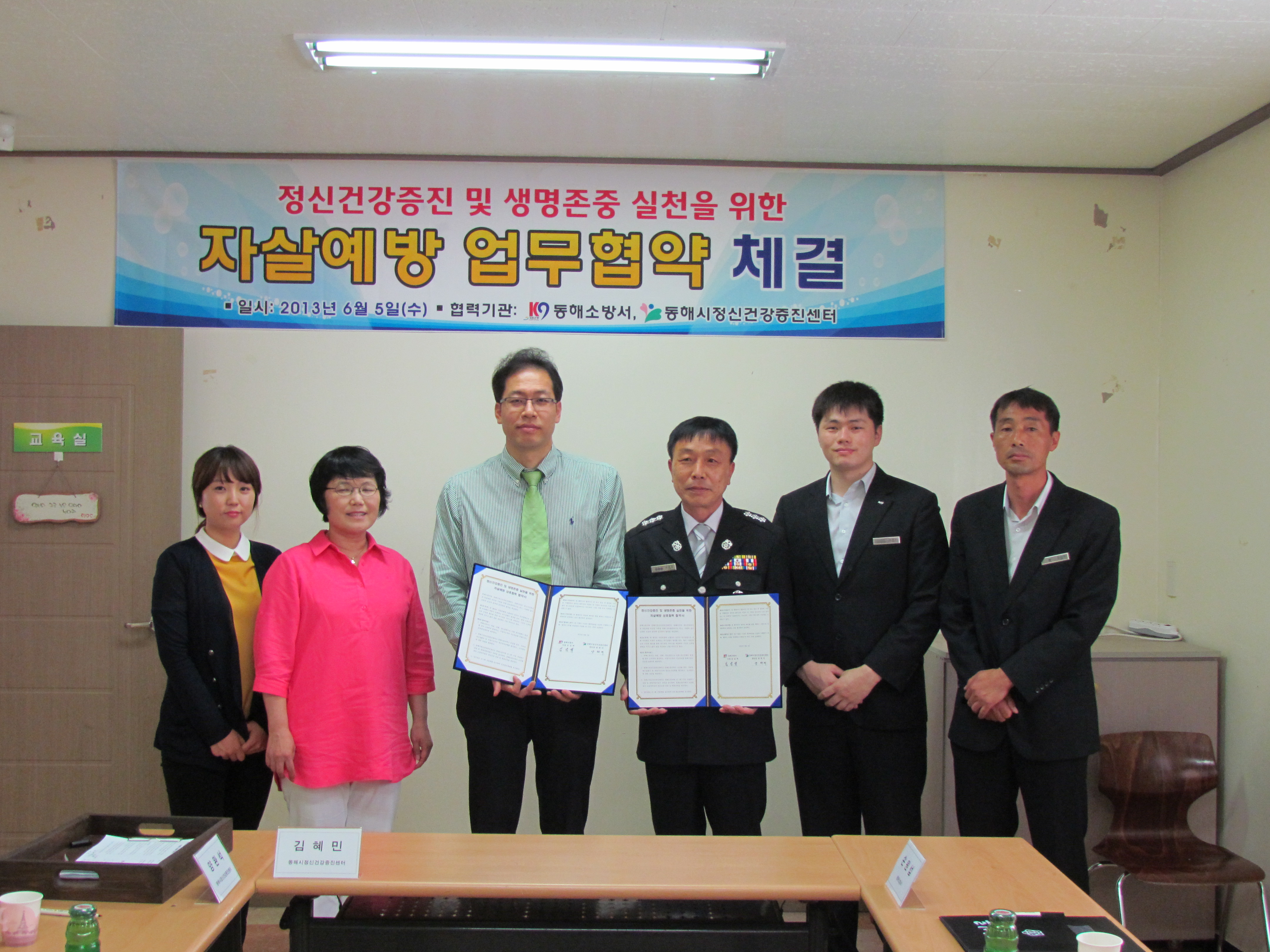 동해소방서(서장 김남백)는 5일 오후 2시 동해시정신건강증진센터와 생명존중문화 조성을 위한 자살예방 업무협약(MOU)을 체결했다.