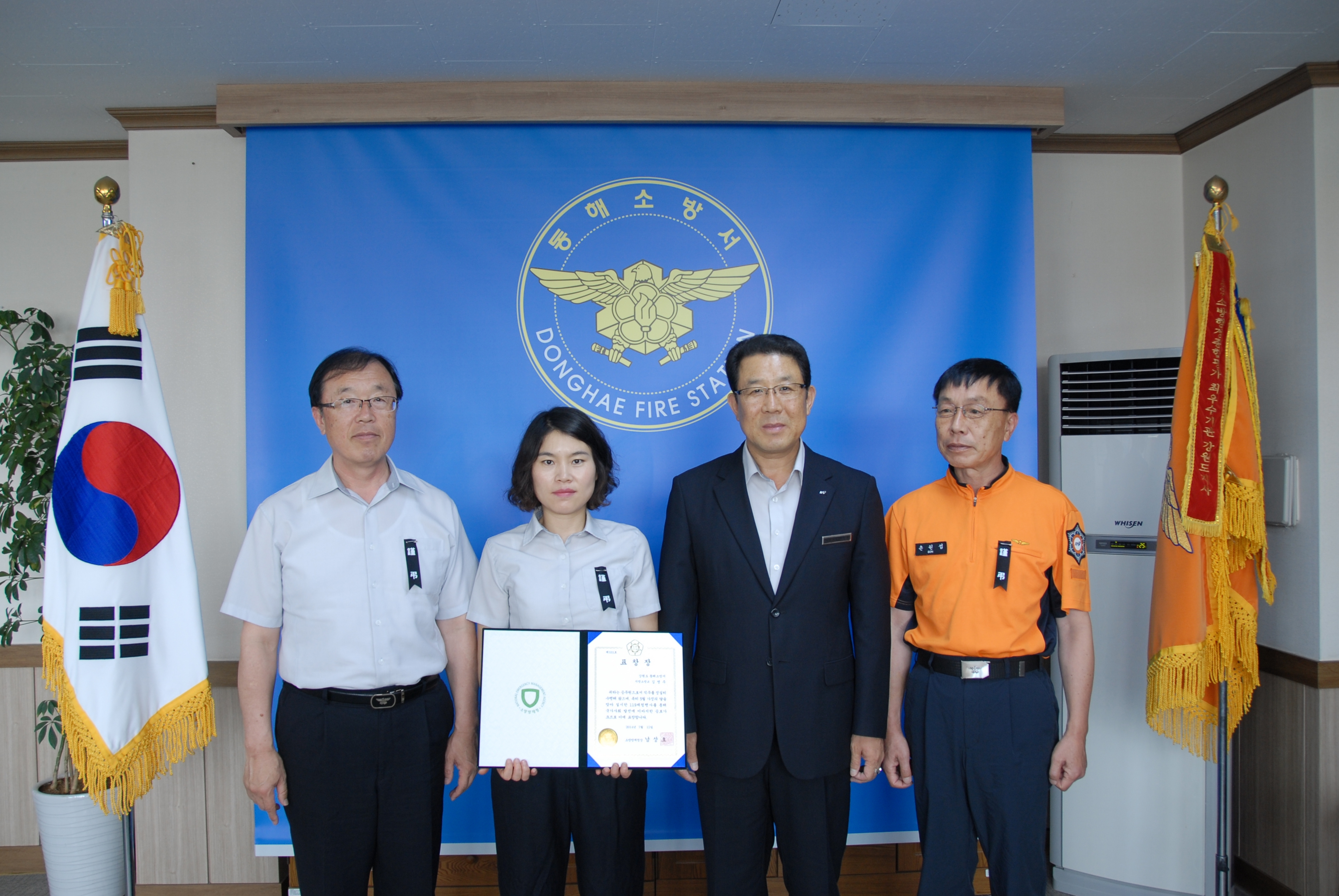 동해소방서(서장 주항중)는 2014. 7. 21(월) 대회의실에서 방호구조과 소방교 김영주에게 소방방재청장 표창장을 수여하였습니다. 이는 가정의 달을 맞아 실시한 119체험행사를 운영한 공로가 인정되어 표창을 수여하게 되었습니다.