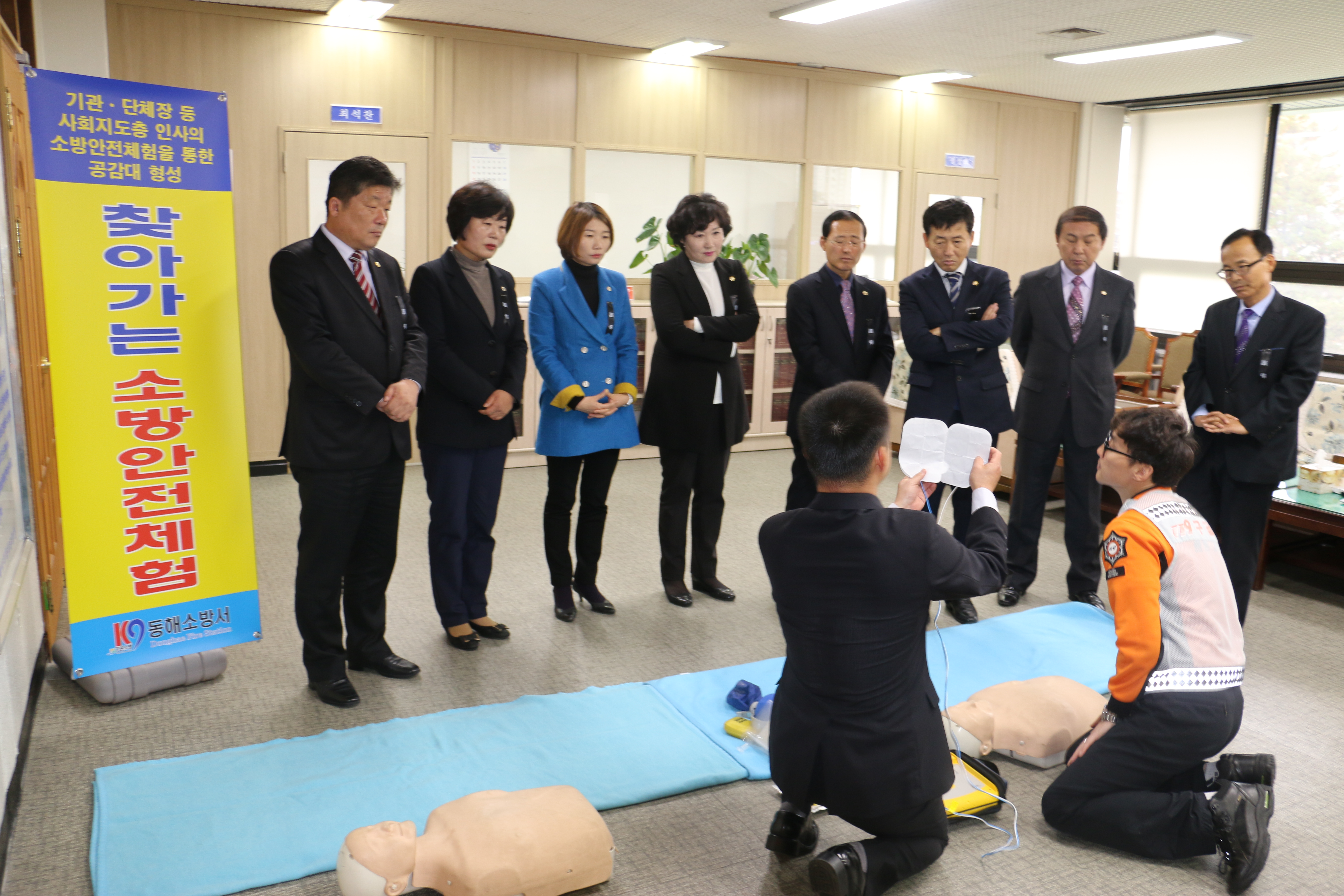 동해소방서(서장 주항중)는 25일(수) 오전11시 동해시의회를 방문하여 김혜숙 동해시의회 의장 외 7명의 의원이 참여한 가운데 사회지도층 인사 대상 겨울철 찾아가는 소방안전체험행사를 가졌다.