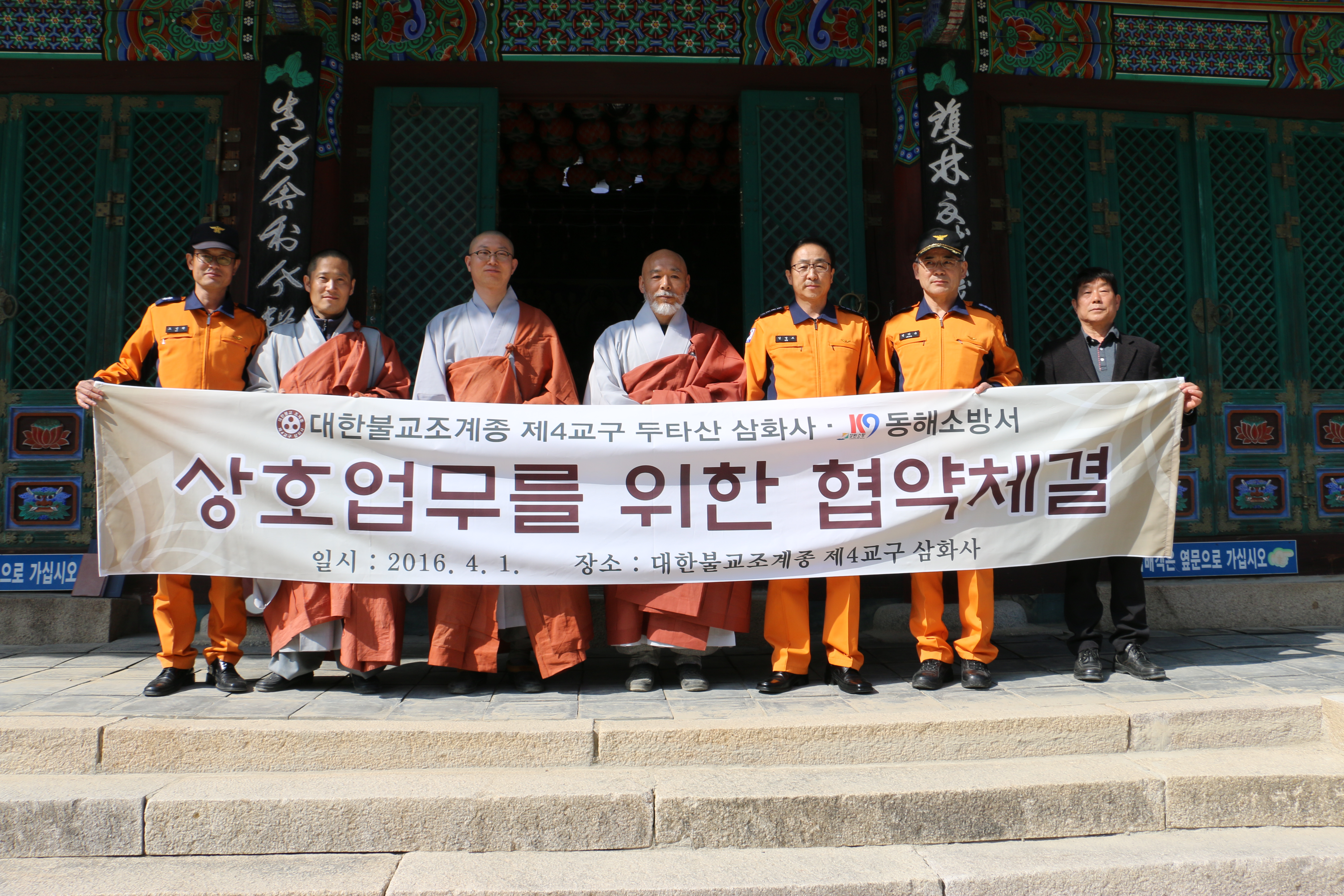 동해소방서(서장 김영조)는 1일(금) 오후 3시 삼화사 적광전에서 대한불교조계종제4교구두타산삼화사(주지 효림)간 상호업무 협력을 위한 업무 협약식을 가졌다.