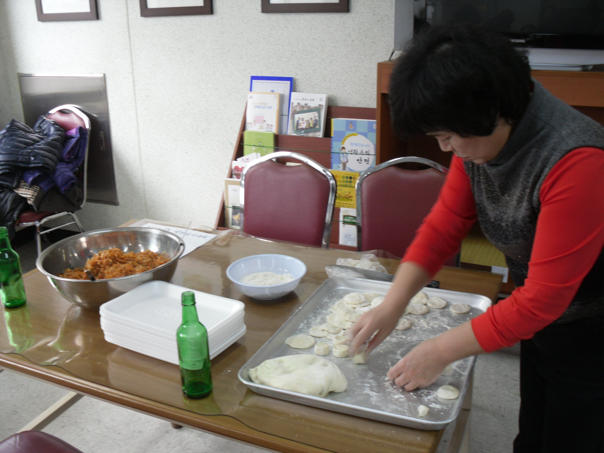 우리 흥업여성대는장애인종합복지관과는 작년 가을 김장담그기로 인연을 맺어 명절맞이 만두만들기 대회의 도우미로 참가했습니다. 9개의 조로 나뉘어 팀별로 장애우 4명씩 본인이 만든 만두 가져가기가 진행되었는데 시각 장애인 한 분은 어찌나 예쁘게 만드시는지.......솜씨가 부러웠답니다. ㅎㅎ