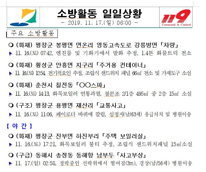 소방활동 일일상황 (11. 17. 일) 06:00