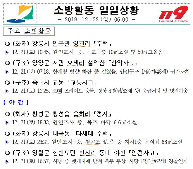 소방활동 일일상황 (12. 22. 일) 06:00