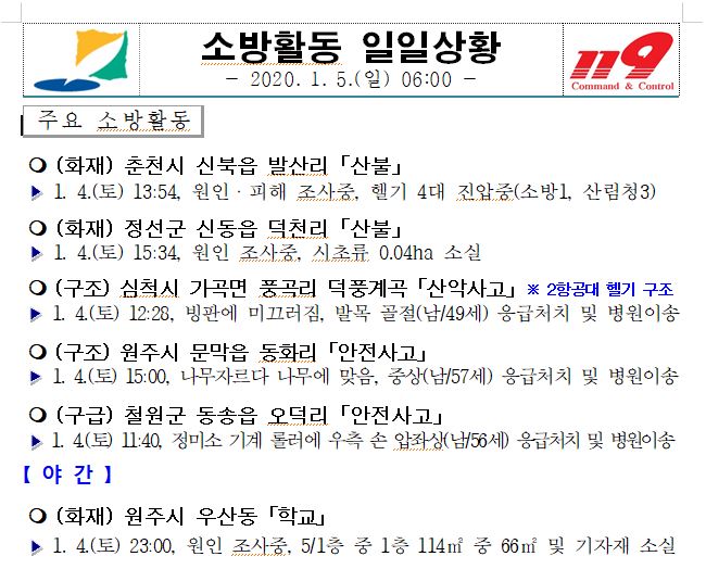 소방활동 일일상황 (1. 5. 일) 06:00