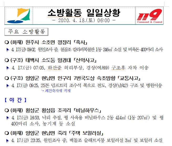 소방활동 일일상황 (4. 18. 토) 06:00