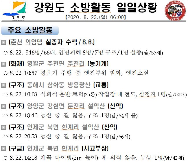 강원도 소방활동 일일상황(8. 23. 일) 06:00