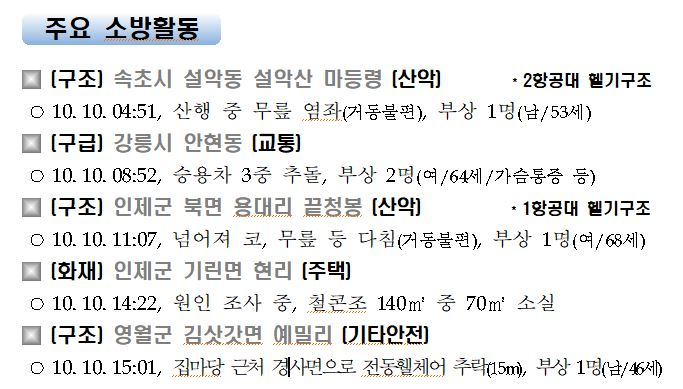 강원도 소방활동 주간상황(10. 10. 토) 17:00