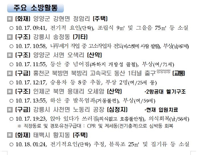 강원도 소방활동 일일상황(10. 18. 일) 06:00