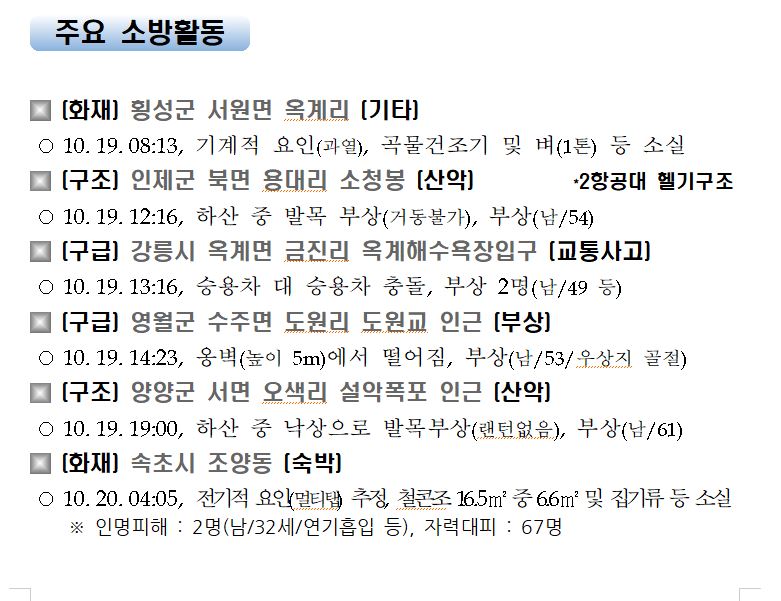 강원도 소방활동 일일상황(10. 20. 화) 06:00