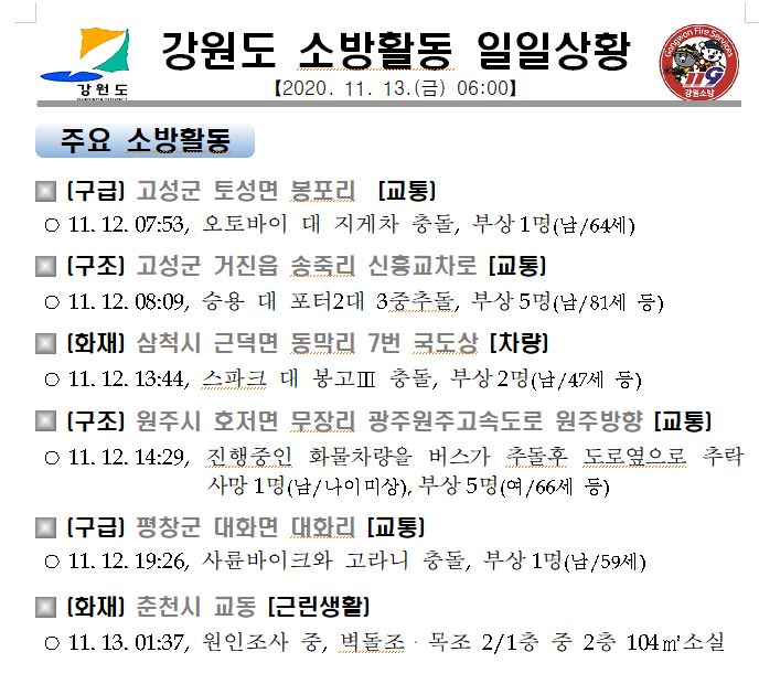 강원도 소방활동 일일상황(11. 13. 금) 06:00