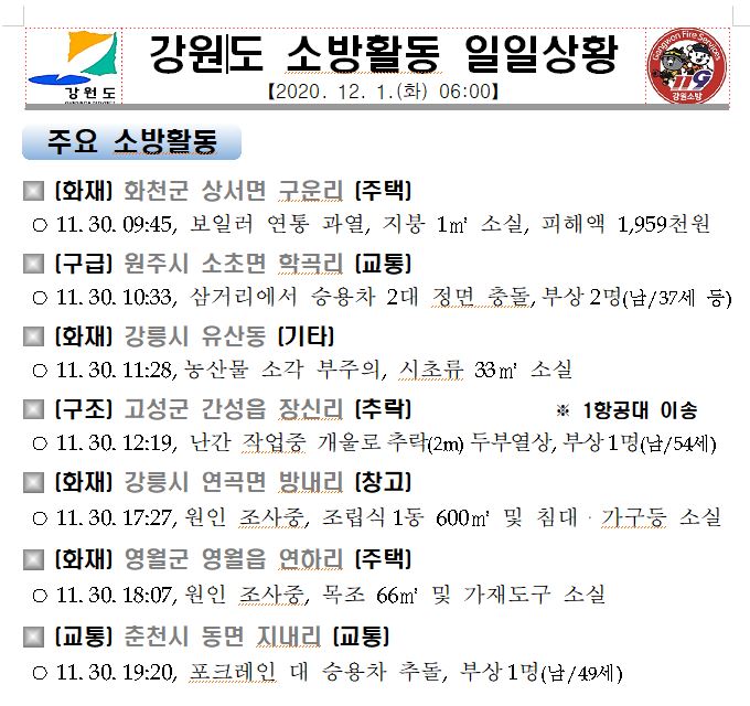 강원도 소방활동 일일상황(12. 1. 화) 06:00