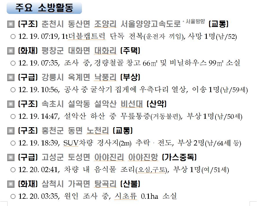 강원도 소방활동 주간상황(12. 20. 일) 17:00
