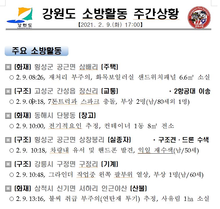 강원도 소방활동 주간상황(2. 9. 화) 17:00