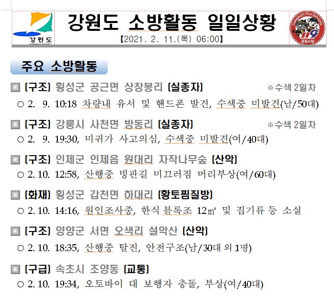 강원도 소방활동 일일상황(2. 11. 목) 06:00