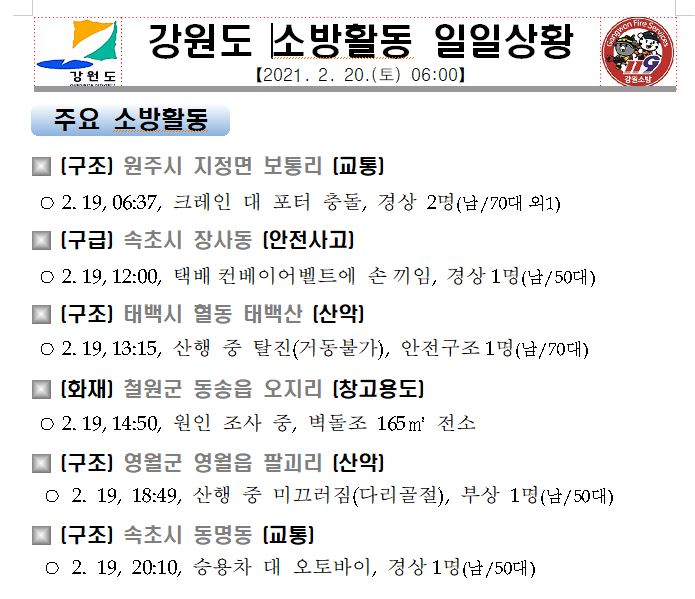 강원도 소방활동 일일상황(2. 20. 토) 06:00