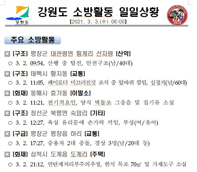 강원도 소방활동 일일상황 (3. 3. 금) 06:00