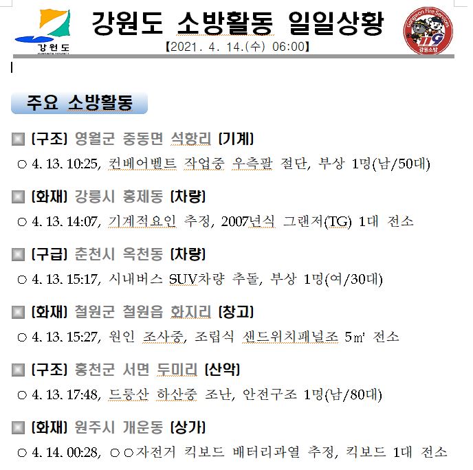 강원도 소방활동 일일상황 (4. 14. 수) 06:00