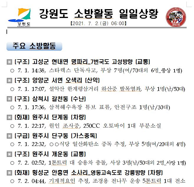 강원도 소방활동 일일상황 (7. 2. 금) 06:00