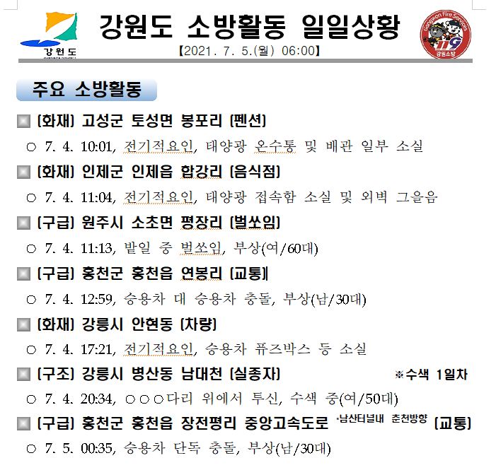 강원도 소방활동 일일상황 (7. 5. 월) 06:00