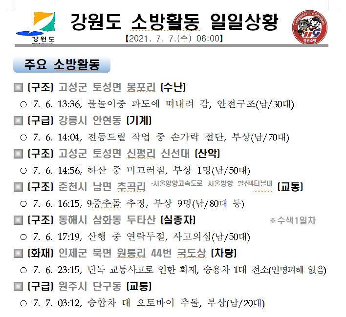 강원도 소방활동 일일상황 (7. 7. 수) 06:00