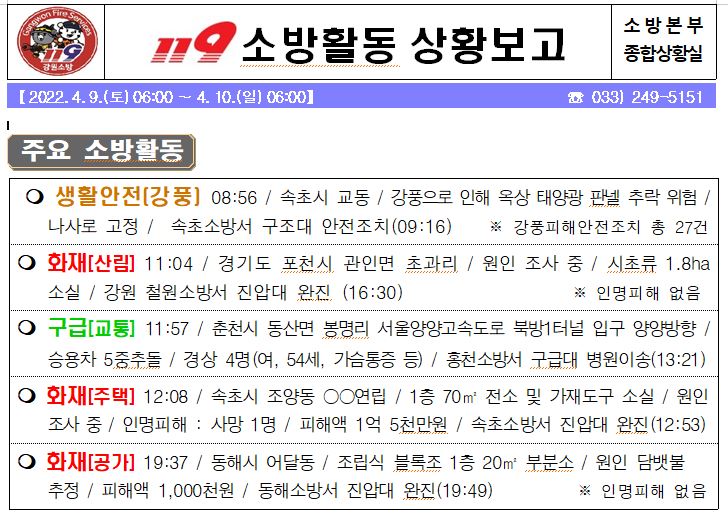 119 소방활동 상황보고(4. 10. 일) 06:00