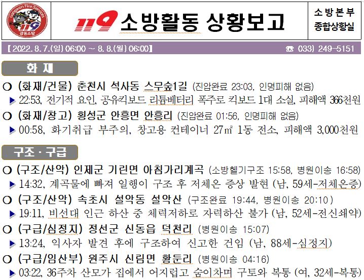 119 소방활동 상황보고(8. 8. 월) 06:00
