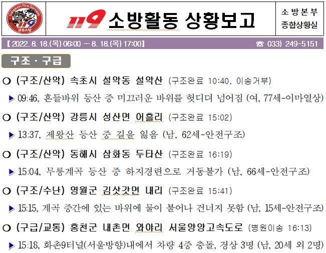 119 소방활동 상황보고(8. 18. 목) 17:00