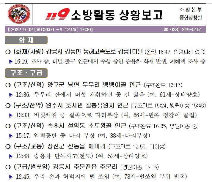 119 소방활동 상황보고(09. 12. 월) 17:00
