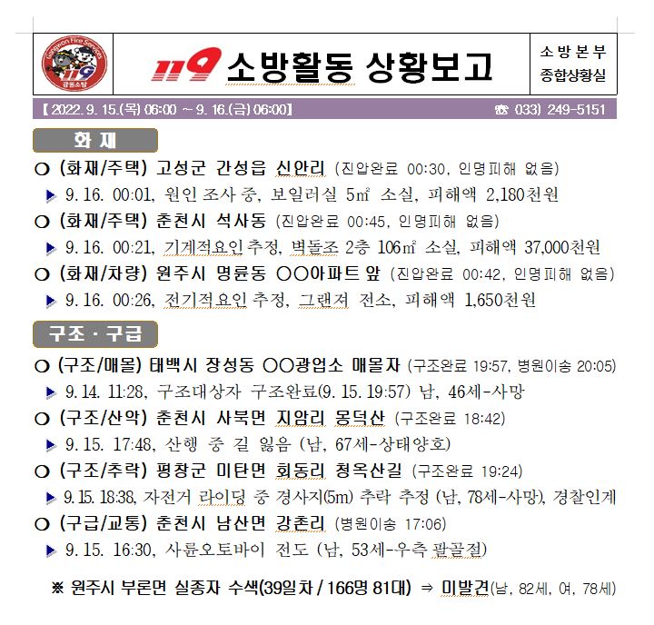 119 소방활동 상황보고(9. 16. 금) 06:00