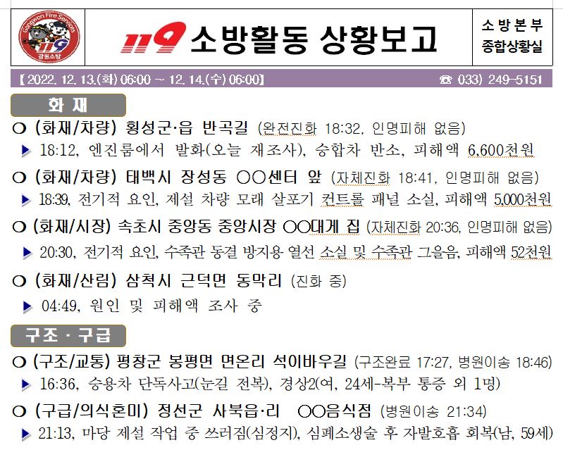 119소방활동 상황보고(12.14. 수) 06:00