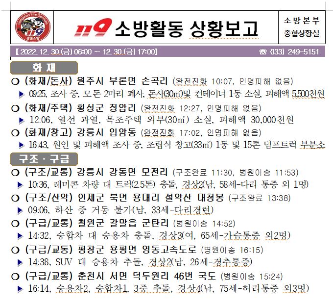 119 소방활동 상황보고(12. 30. 금) 06:00