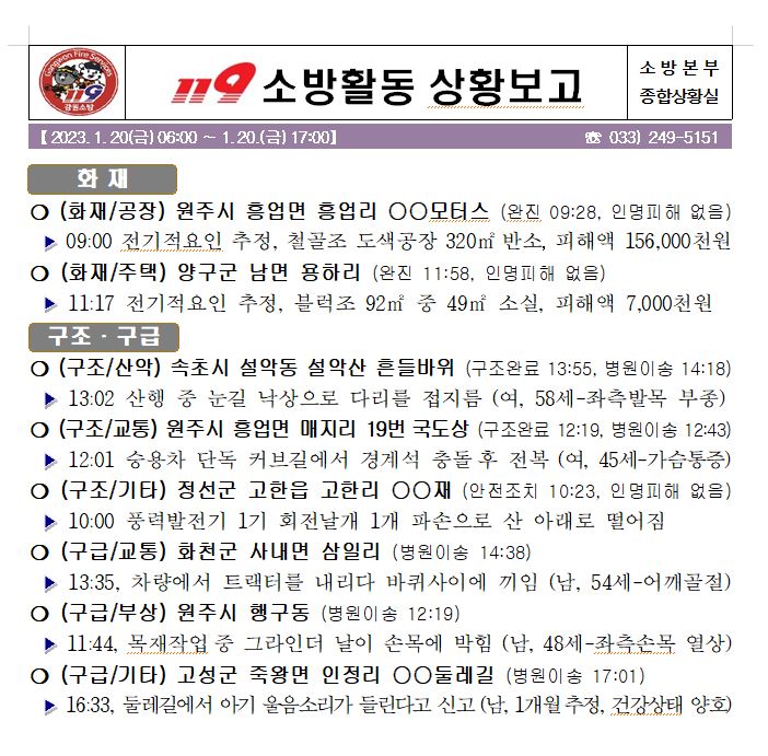 119 소방활동 상황보고(1. 20. 금) 06:00