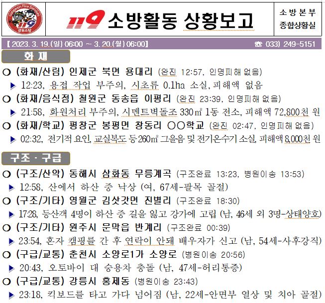 119 소방활동 상황보고(3. 20. 월) 06:00